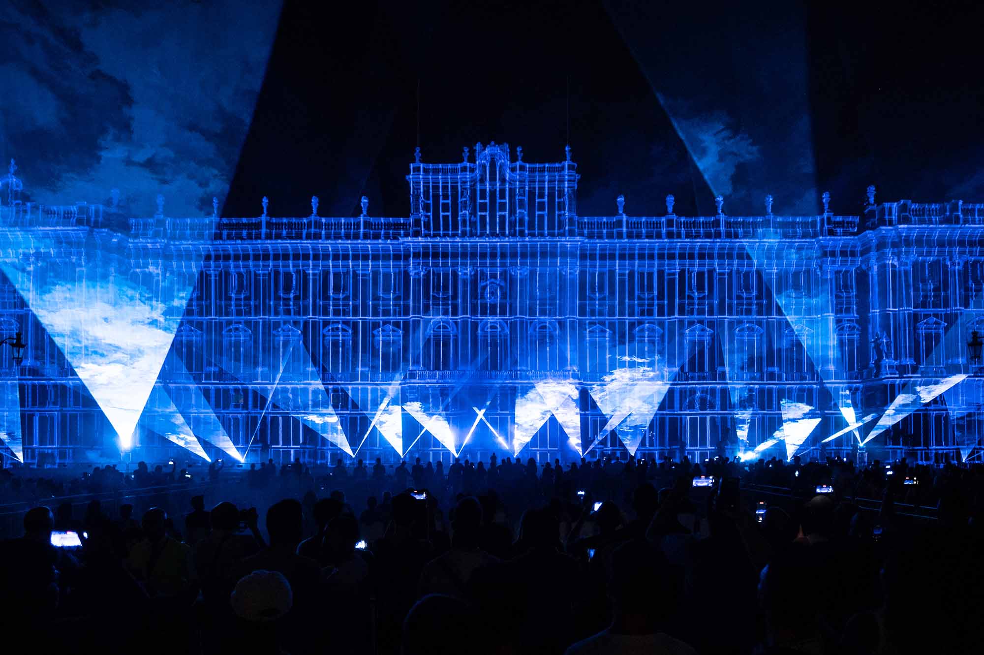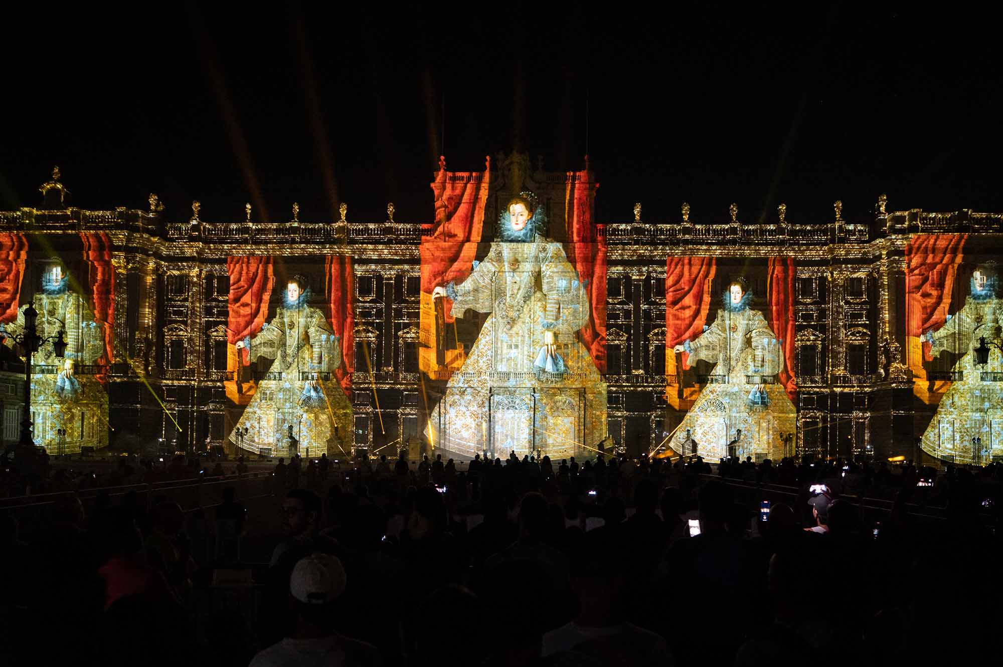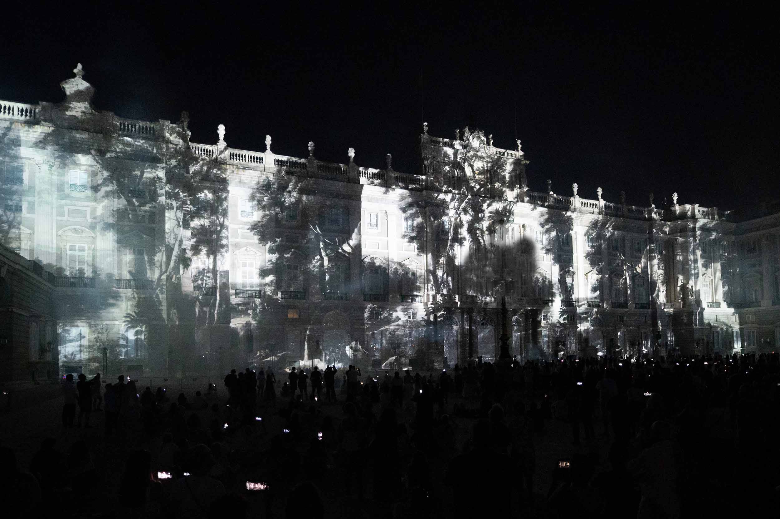 During two evenings, more than 45.000 spectators enjoyed a videomapping show, open to the public and free of charge. In this show, the visual content is divided into six scenes, each dominated by a different color parameter: from the initial black and white to the sublime golden hue of the thread used in many of the Royal Collections’ tapestries, to the vibrant red of Lucrecia taking her own life (Maratti) or the deep blue of the midday sky in the Allegory of Noon (Mengs).