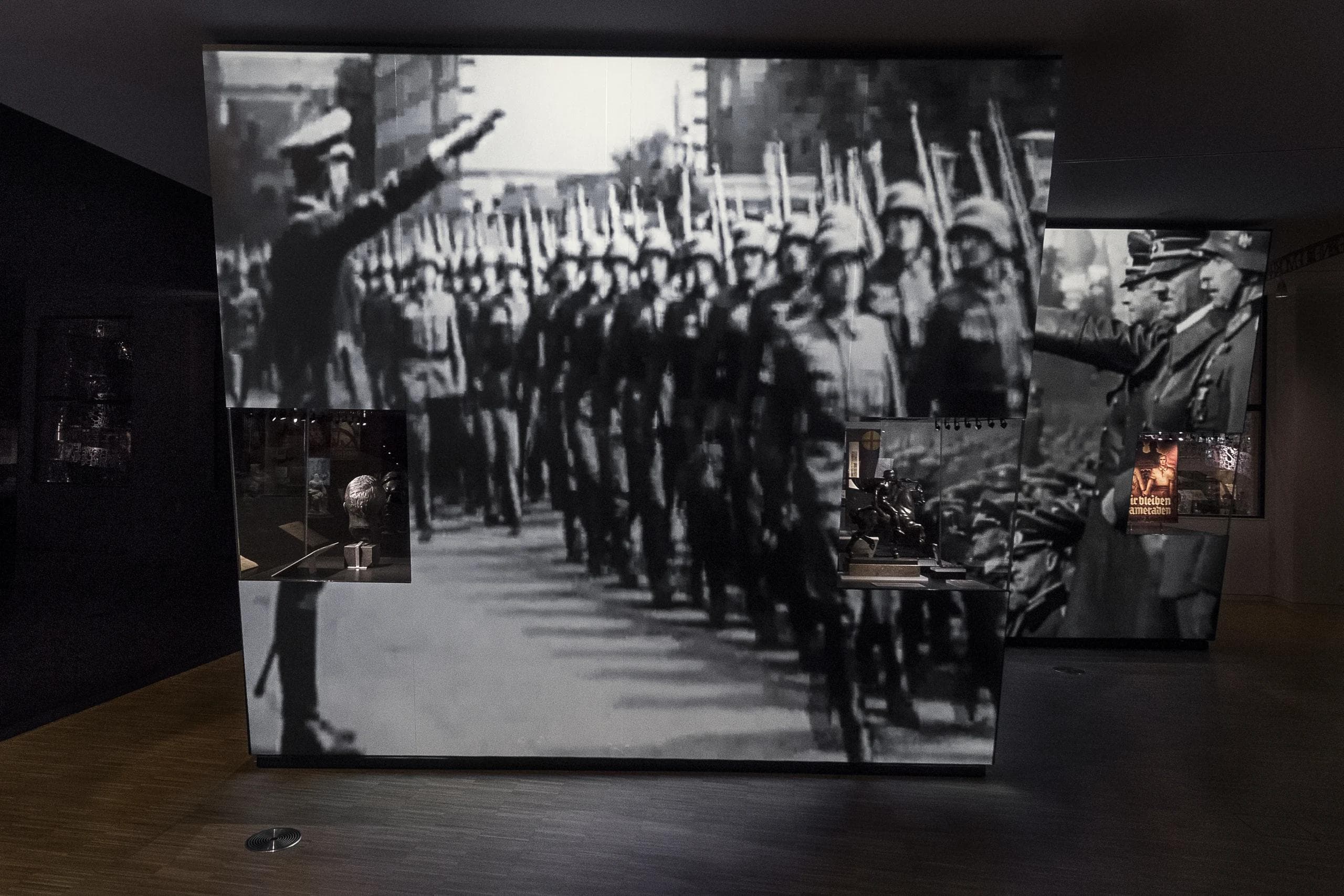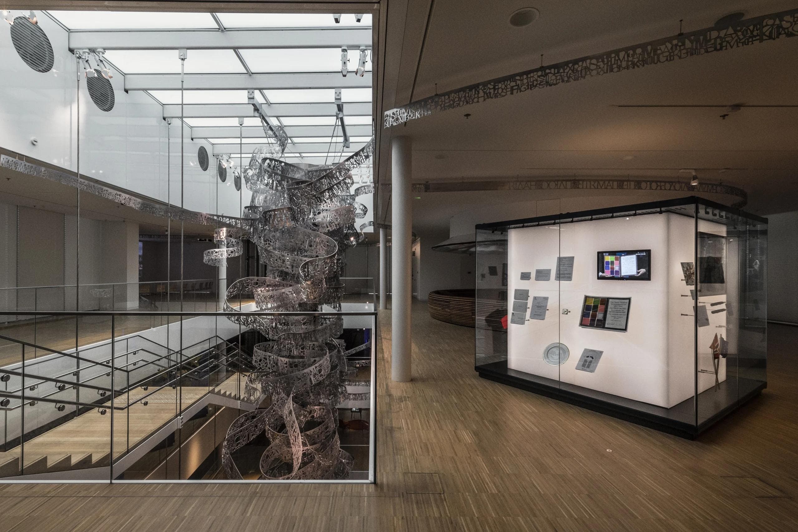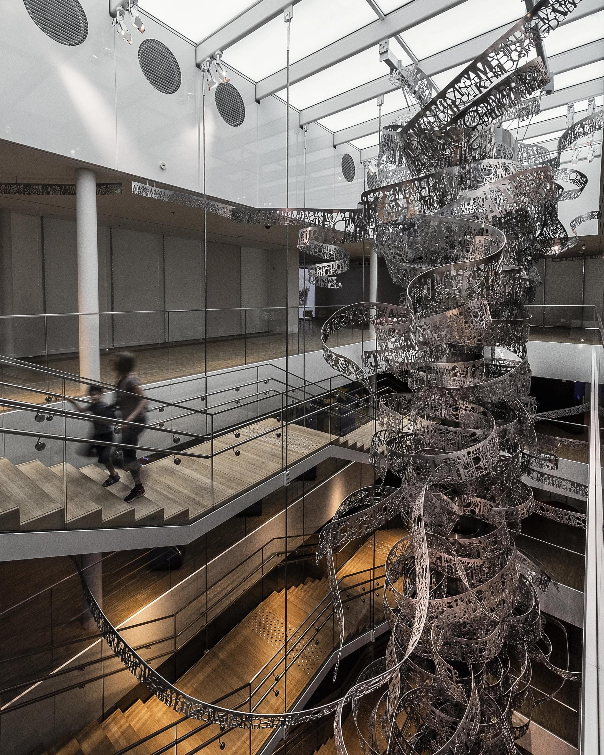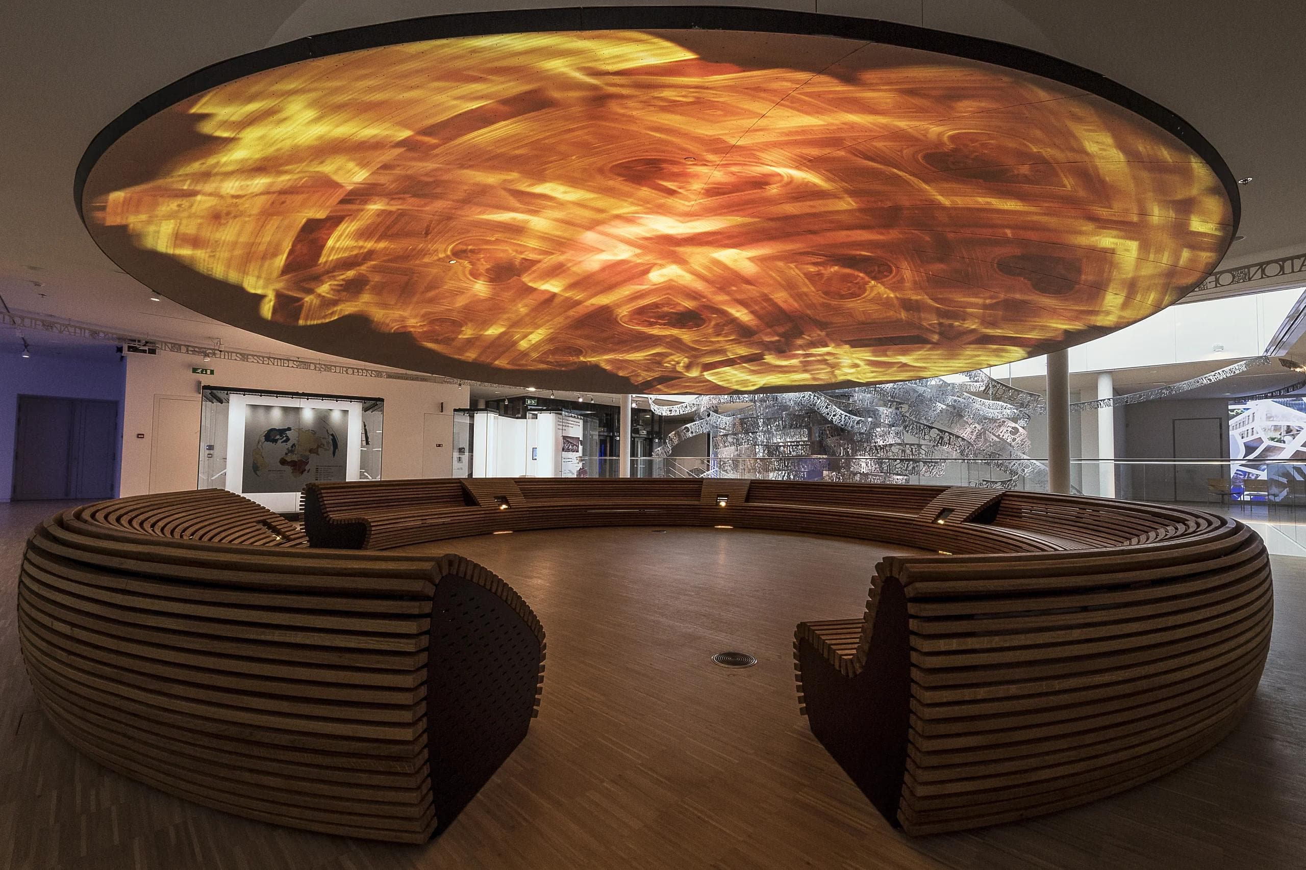 We were commissioned to design and supervise the production of the permanent exhibition. We combined traditional methods with cutting-edge technology to engage visitors in an educational manner. We designed the Vortex of History, a twenty-five-meter high metal installation panning six floors, made from aluminum-magnesium alloy and steel. It represents the dynamism of European history and its ever-changing interpretations. Up close, the vortex behaves like an organic and living element that floats under the skylight, accompanying a visitor during their entire visit.
